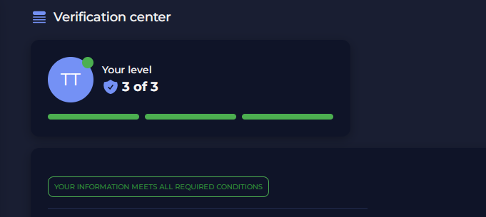 Right after completing a short registration, your account will be assigned Verification Level 1. You can check it in the Dashboard by clicking on Profile → Verification Center.”