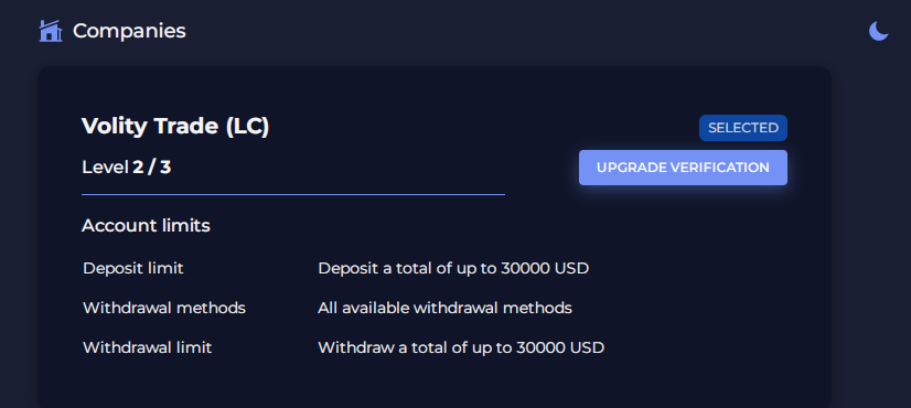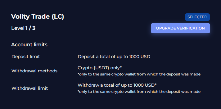 Depending on the level of verification, certain limits apply in Volity regarding deposit methods, withdrawals, and deposit amounts. Our company has three verification levels.