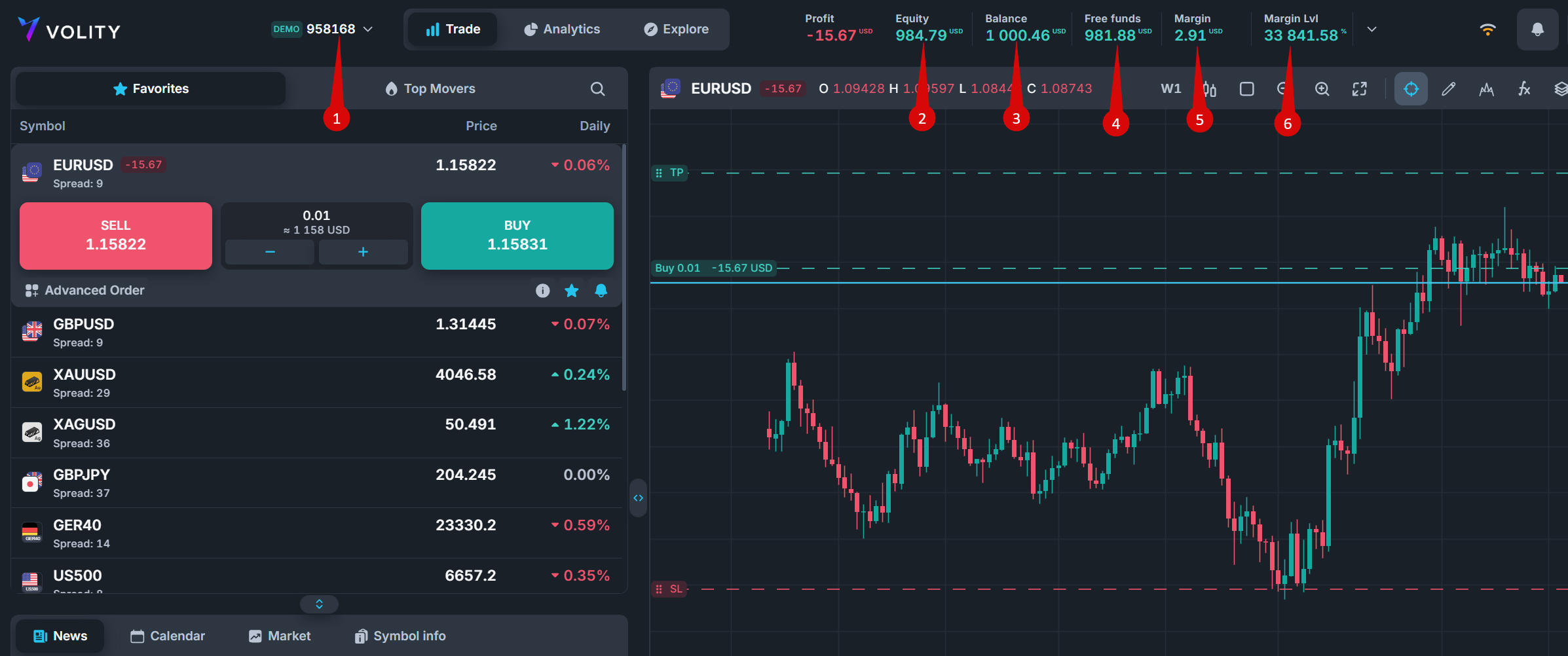 On the Volity trading platform, you have access to all important information about your trading account. This is where traders spend most of their working time. This is your working tool.